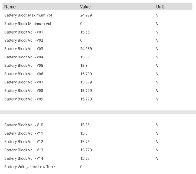 Most cells seem to be a fairly normal 15.7v to 15.8v range. The internal resistance readings of all the cells were identical so I doubt we have an actual cell issue but more then likely an issue with either the battery pack voltage sensor wiring such as a break in cell V02 wiring, shorting between V02 & V03 wiring, the control unit itself or both.