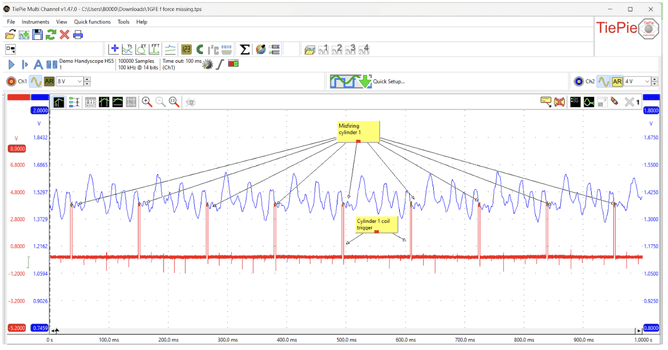 On your ATS scope one channel will measure the G Force sensor. On another channel you can measure a reference point such as fuel injector or coil number one. This enables you to locate, via firing order, which cylinder/cylinders are giving issues.