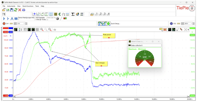 In the below graph you can see the 1-2 and the 2-3 gearshifts in the green trace of scope recording. Peak power is not applied in first gear so as to not excessively burn up the tyres and load the driveline. In second gear an extra 25 kw is applied by engine, peaking at just above 150 KW on this late model Hyundai iload van which by the way took around 15 minutes of work