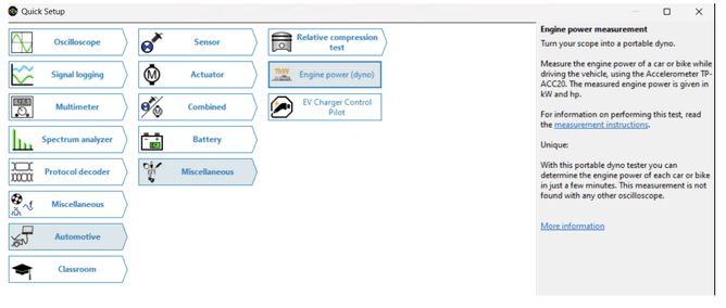 Simply open the measuring software, enter the weight of the vehicle to the software, find a flat piece of road of suitable length and drive from stationary to 3rd gear as fast as possible, then release the accelerator and count to 5 before braking.