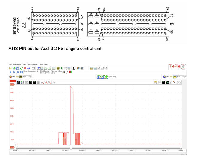 ATS scope recording of Audi HP fuel pump. We can see the control of the solenoid charging by the engine ECU, power, ground while activated.