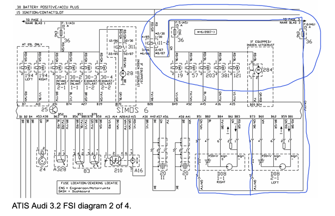Without digging to deeply we can see the relay 11-2 is the power supply to the HP fuel pump ( component 203 ), oxygen sensor heater circuits ( D08 ), manifold adjustment runner solenoid ( 57 ). All components highlighted in our original fault code report. Relay 11-2 is supplied power is to activate by relay 11-1 in the corresponding diagram. Relay 11-1 runs the ignition coils. We have had a running but not revving engine so it is a reasonable conclusion that we had a failure of relay 11-2. This was replaced and no revving issues or engine light since.