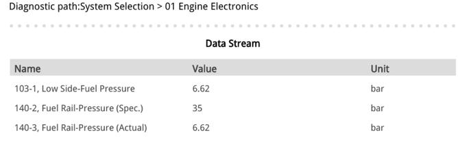 The technician had viewed live data for the engine sensors. He had noted that the actual fuel pressure for the high pressure pump was identical to the low pressure pump. The engine control unit was commanding 35 bar but only achieving 6.62 bar.