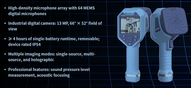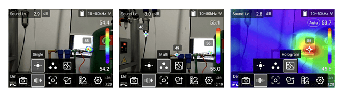 By combining acoustic images with dB-level datta output, it is well suited for locating and diagnosing a wide range of industry sound sources. This enhances the intuitiveness, efficiency and safety of inspections