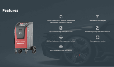 The LAUNCH Cat 601 has superseded the CAT501 and is the latest intelligent and fully automatic transmission fluid exchange station. It can complete a full transmission flush in less than 20 minutes (transmission, torque converter & cooler). The 601S is equipped with comprehensive range of adaptors allowing connection to more transmissions including double clutch and CVTs. It is also compatible with the CAT remote to control equipment operations for the main functions, and includes an ATF oil sampling function.