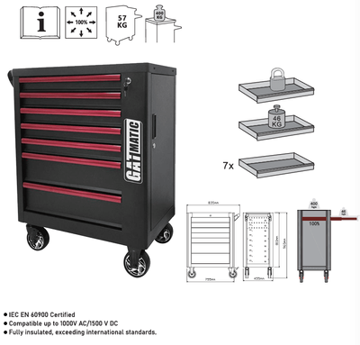A high quality IEC EN 60900 Certified (100v AC / 1500 V DC) fully insulated cabinet and tool set for the professional Hybrid and EV workshop